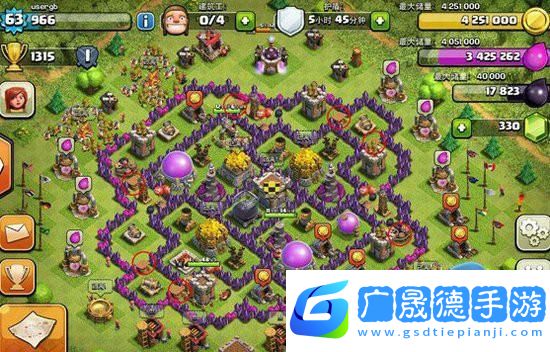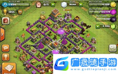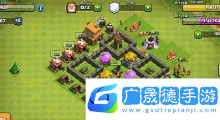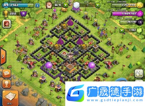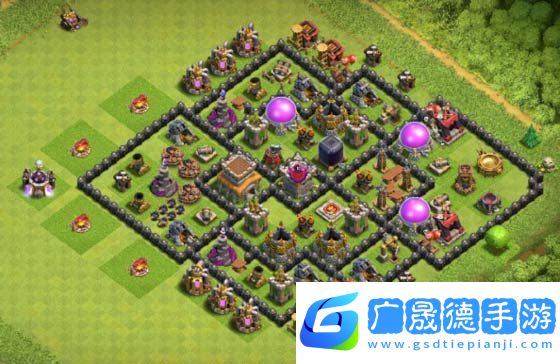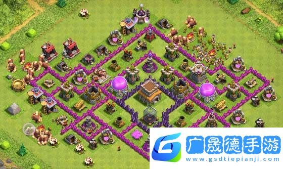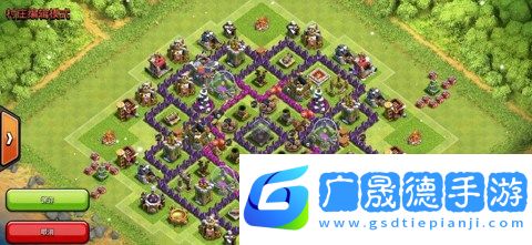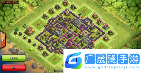 五、外循环陷阱阵最外的箭塔和炮塔没有阻挡,狭小位置放置陷阱,法师塔、迫击炮活力均衡,防空塔三角之势、资源库分离。黑水与部落城堡在中间,防止援兵被偷袭。