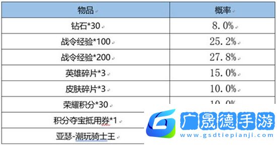 【亚瑟-潮玩骑士王】打开可随机获得以下奖励之一:亚瑟-潮玩骑士王、积分夺宝抵用券*1、英雄碎片*3、皮肤碎片*3、荣耀积分*30、100/200战令经验、钻石*30。
