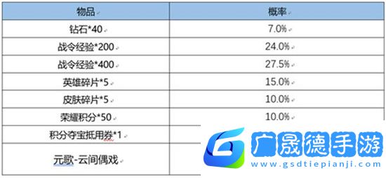 【元歌-云间偶戏】打开可随机获得以下奖励之一:元歌-云间偶戏、积分夺宝抵用券*1、英雄碎片*5、皮肤碎片*5、荣耀积分*50、200/400战令经验、钻石*40。