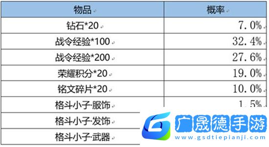 【鲁班星元礼包】打开可随机获得以下奖励之一:格斗小子·服饰、格斗小子·发饰、格斗小子·武器、荣耀积分*20、100/200战令经验、钻石*20、铭文碎片*20。