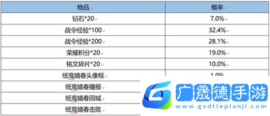 【纸鸾嬉春系列礼包】打开可随机获得以下奖励之一:纸鸾嬉春头像框、纸鸾嬉春播报、纸鸾嬉春回城、纸鸾嬉春、荣耀积分*20、100/200战令经验、钻石*20、铭文碎片*20。
