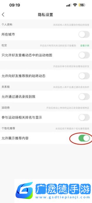 第三步:在隐私设置页面,把【允许展现推荐内容】选项关闭即可,如图所示。
