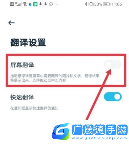 来到翻译设置,然后把【屏幕翻译】的按钮开启。