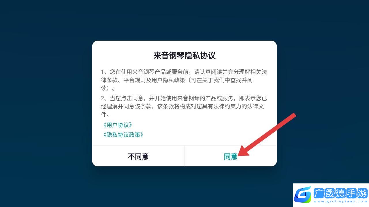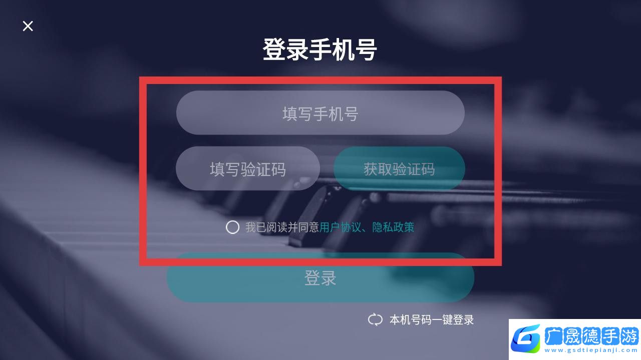 1、打开来音钢琴软件,阅读隐私协议后点击同意,进入登录页,填写手机号,获取并填入验证码,勾选协议后登录。