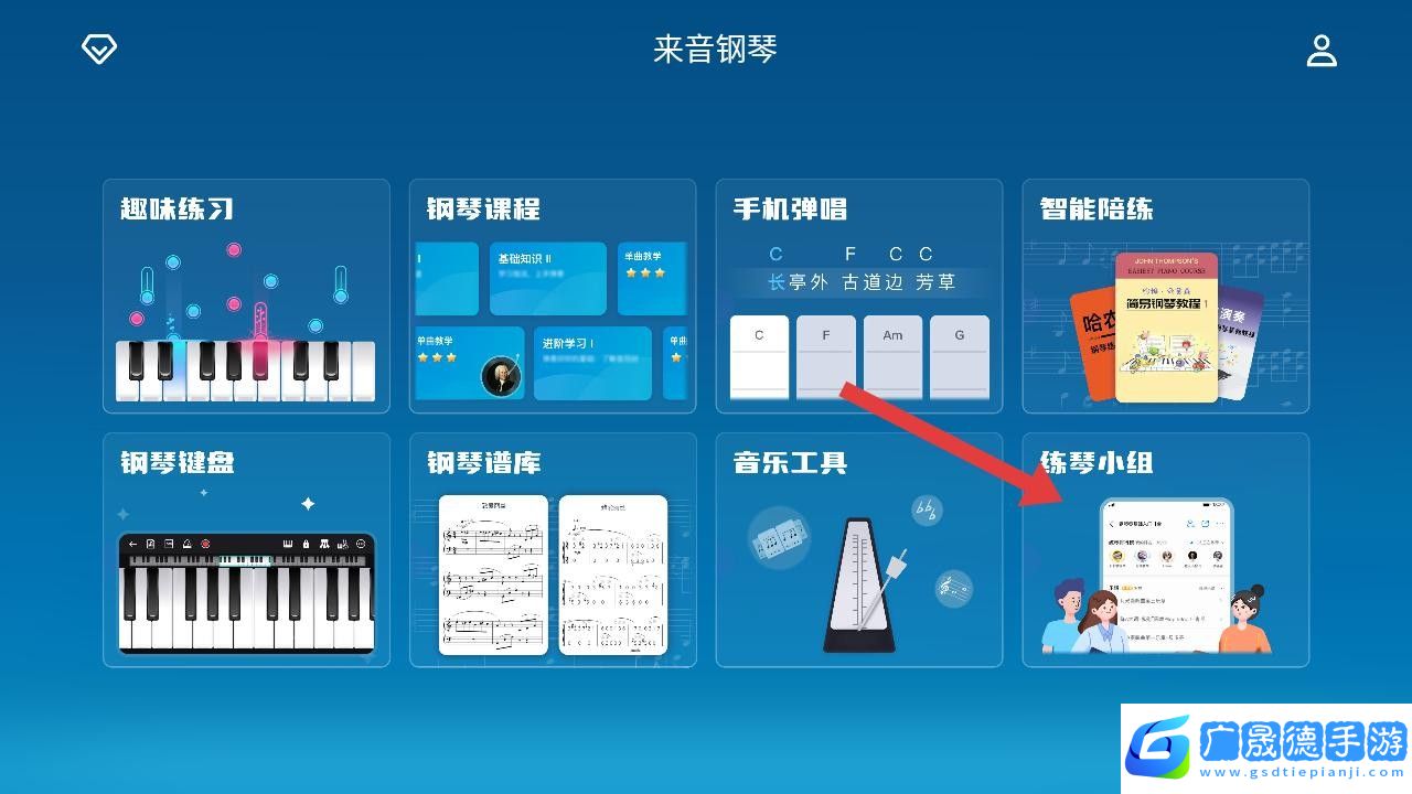 3、比如点击练琴小组,可加入小组互动练琴;选钢琴课程,能学习钢琴知识,开展练琴等操作。