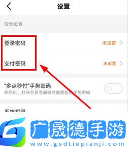 2、然后可以在系统设置界面中看到登陆密码和支付密码的设置选项了,点击进入修改密码即可