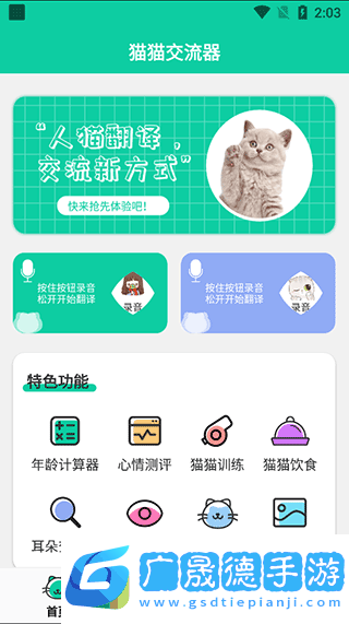 【人猫互译】不仅可以把主人的声音变换为猫语翻译,还可以将猫语翻译成人语,让主人和猫咪的沟通更顺畅,关系更亲密!获得猫咪的注意力,聆听猫咪、猫咪心声。