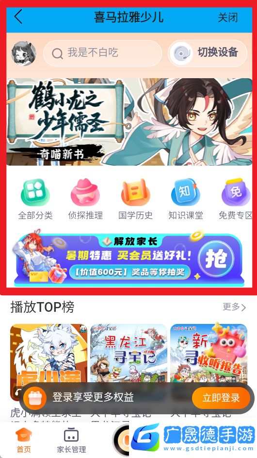 3、在“少儿”页面可听喜马拉雅少儿内容,点击分类图标可选择不同类型的知识课程。