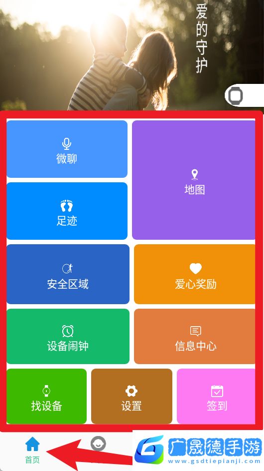 2、进入摩臣平台首页后,可在彩色模块中选择微聊、地图、足迹等功能进行孩子管理操作。