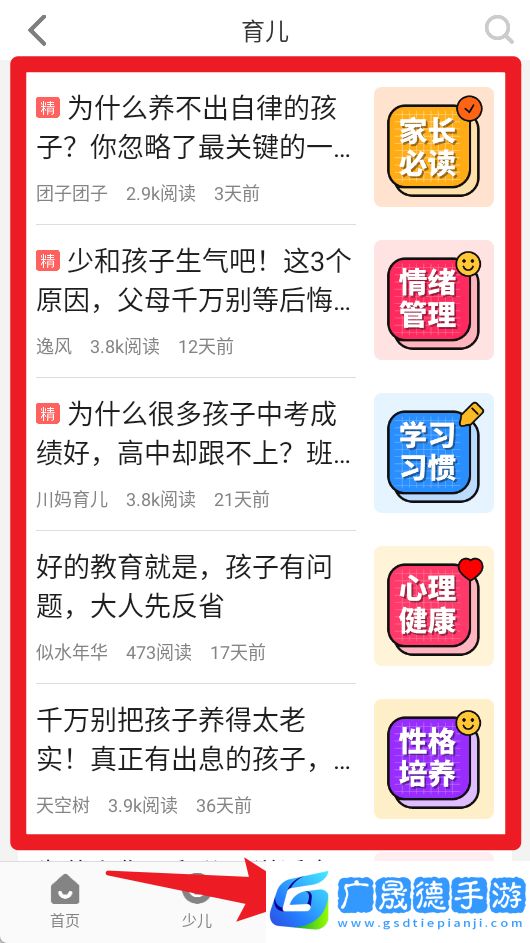 4、点击底部“育儿”按钮进入育儿文章专区,获取每日育儿知识与家教经验内容推荐。