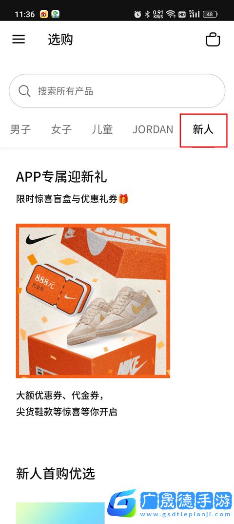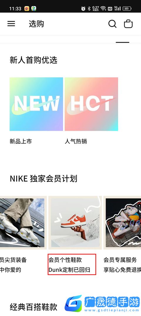 来到软件摩臣平台首页之后,找到新人,然后滑动到下方找到nike会员独家计划,在其中有一个会员定制鞋款,点击;