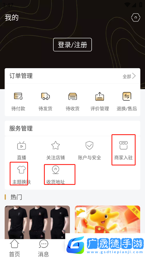 3、用户可以在我的里面填写收获地址,查看订单物流,并且还提供主题换肤和直播功能。