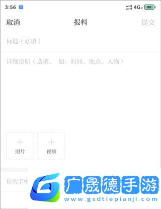 2、编辑页面输入报料标题,报料内容,以及相关的图片资料,接着点击右上角【提交】,即可完成投稿