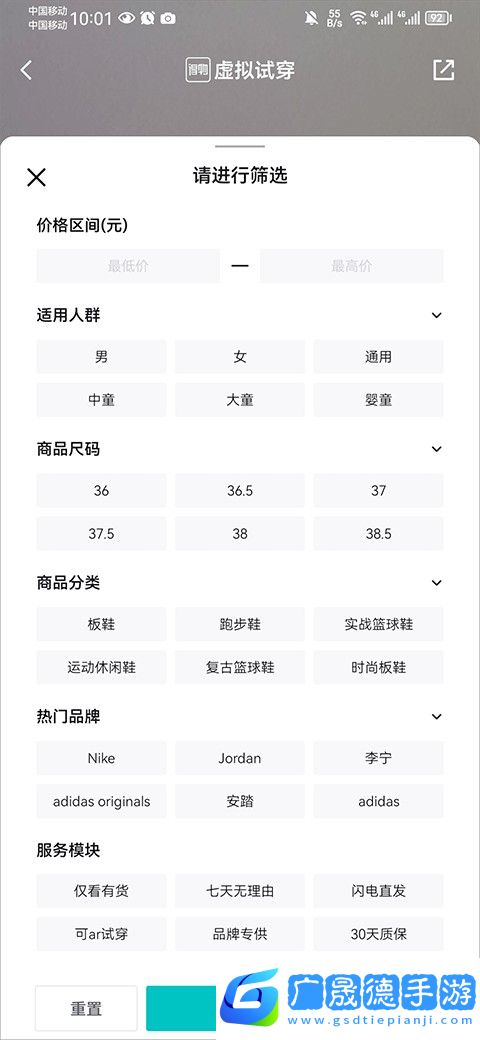 4、点击录屏右边的筛选按钮,还可以按照价格、品牌、尺码、类型等来筛选合适的鞋子