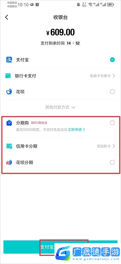 3、最后在支付的时候选择分期购、信用卡分期、还是花呗分期进行付款即可