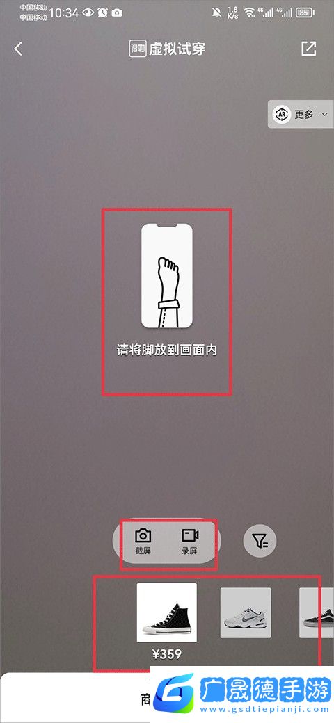3、然后在虚拟试穿界面中,将脚放到画面内,并在下方左右切换鞋子进行试穿,满意后可以进行截屏或录屏