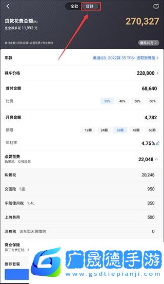 6、最后我们再点击上方的贷款按钮进行切换,在这里我们就能看到分期计算的一些具体金额了。用户还可以对首付比例、月供期限、年利率进行调整,软件会及时计算出相应的首付金额和月供金额。
