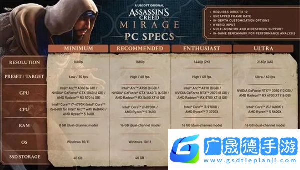 刺客信条:幻景是育碧旗下历史架空开放世界动作游戏刺客信条的最新作品,游戏将于2023年10月5日正式与ps、xbox和ubisoft connect平台发售,该作最低配置要求为1060 6gb运行。