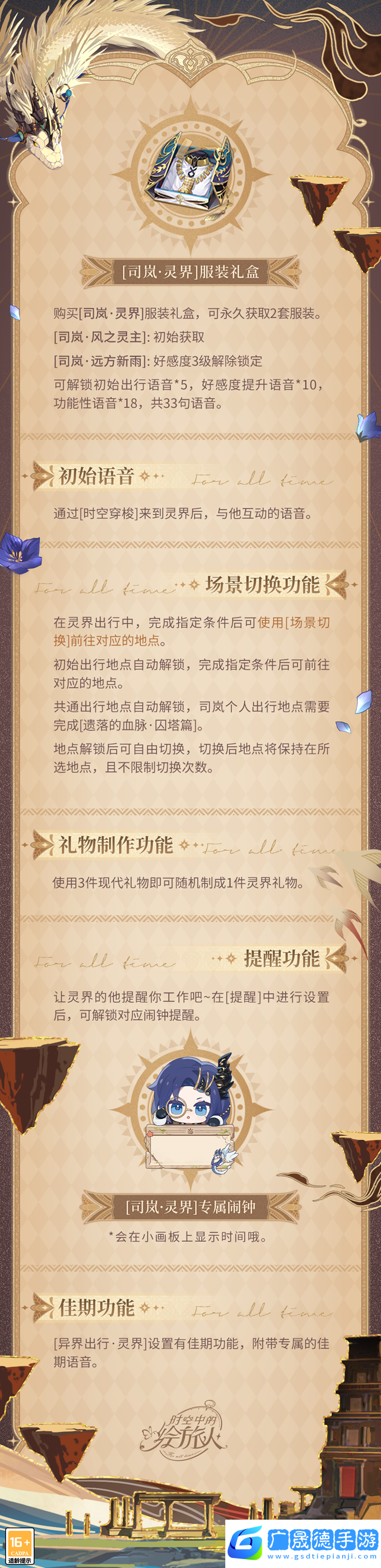 7月4日更新后 - 7月11日05:00,[司岚·灵界]服装礼盒上线,获取服装后可在[异界出行]中解锁角色。