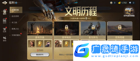 新福利,只要任意充值均可获得时代货币,在不同文明时可消耗货币领取不同阶段的奖励,奖励给得很丰厚。