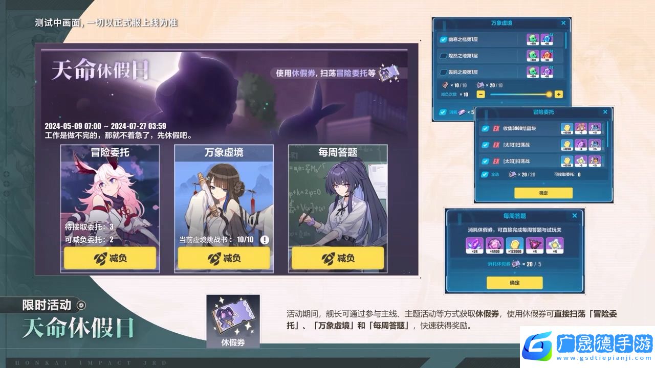 为助力舰长们减负护肝,7.6版本正式推出了「天命休假日」限时活动。活动期间,舰长可以通过参与主线、主题活动等版本内容获取休假券;使用休假券可直接扫荡「冒险委托」、「万象虚境」和「每周答题」,快速轻松获取奖励。