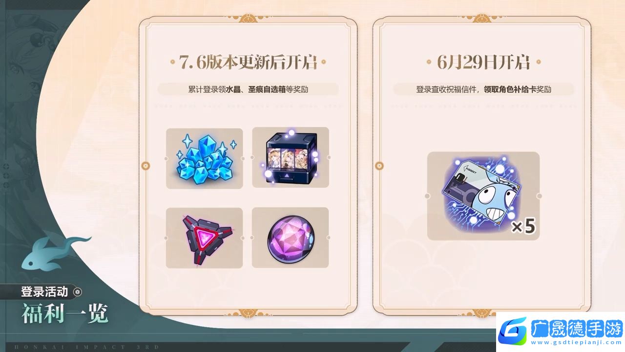 7.6版本累计登录活动现已开启!参与7天登录活动即可领取水晶、「叶之所见」圣痕自选箱等奖励。此外,6月29日还将开启「大吉答礼」活动,舰长们登录查收祝福信件,即可领取松雀送出的5张「角色补给卡」!