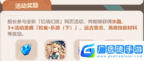 3、舰长参与全新「忆境幻旅」网页活动,将能够获得水晶3*活动圣痕「松雀·乐游(下)」、远古意志、高级技能材料等奖励。