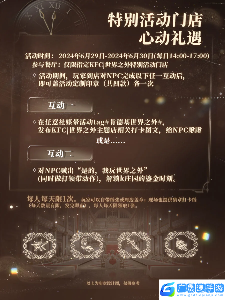 *特别提醒:本次kfc联动全部印章物料,都将在活动开始后上传至【世界之外官方网站】,方便所有对定制印章感兴趣的玩家获得物料,欢迎前往世界之外摩臣平台官网自行下载留念。