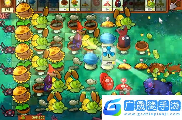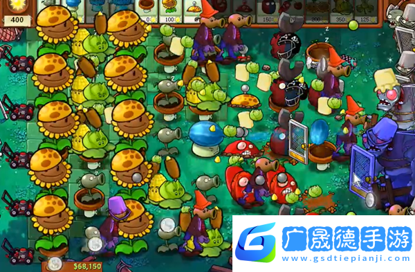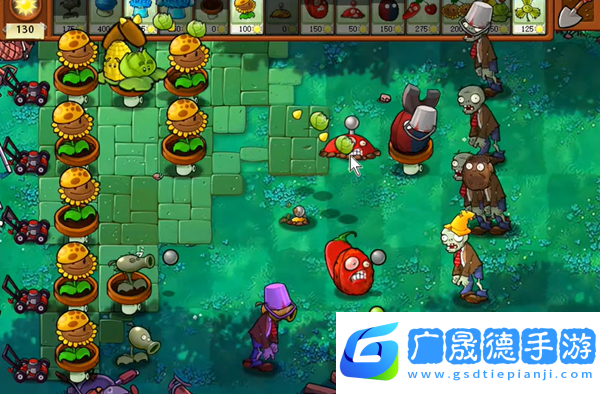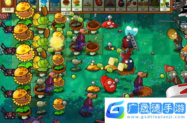 3、土豆雷的cd一好就去种植,0阳光的植物建造怎么都不会亏,然后继续建造僵尸豌豆,确保每一路有一个。